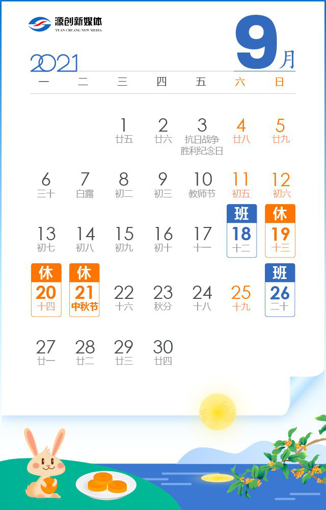 9月19日至21日放假調(diào)休,共3天。9月18日(星期六)上班。
