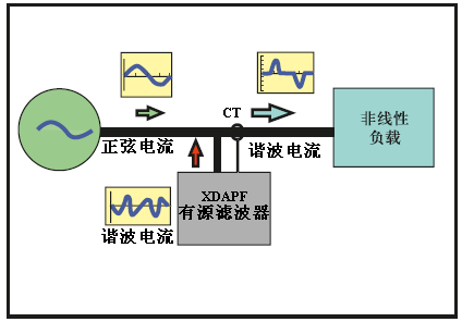 XDAPF通過外部CT測(cè)量負(fù)載電流或電網(wǎng)電流送到信號(hào)板進(jìn)行處理,控制板完成負(fù)荷諧波電流的計(jì)算和諧波電流補(bǔ)償?shù)拈]環(huán)控制,并產(chǎn)生PWM驅(qū)動(dòng)信號(hào)到驅(qū)動(dòng)板,驅(qū)動(dòng)板驅(qū)動(dòng)逆變器的IGBT從而將所需的補(bǔ)償電流輸出到電網(wǎng),完成諧波濾除的功能。