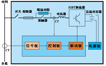 直流電容器為儲(chǔ)能元件并通過IGBT逆變器和接口電抗器電網(wǎng)輸出補(bǔ)償電流;直流電容同時(shí)通過電源板為信號(hào)板、控制板和驅(qū)動(dòng)板提供工作電源。