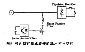 圖5所示為混合型濾波器,它是有源濾波器和無源濾波器的組合結(jié)構(gòu)。這種濾波器結(jié)構(gòu)目前非常普遍,因?yàn)樗⒙?lián)的LC無源濾波器部分消除了大量的低次諧波,因而有源濾波器部分容量可以做到很?。ㄘ?fù)荷容量的5%左右),這樣大大減少了有源濾波器的體積和成本。它可以同時(shí)消除電壓和電流諧波,而且成本相對(duì)來說較低,因而非常受歡迎。但是這種結(jié)構(gòu)的濾波器的缺點(diǎn)在于只能針對(duì)特定負(fù)荷進(jìn)行補(bǔ)償,負(fù)荷運(yùn)行狀況變化較大的時(shí)候補(bǔ)償性能不好。