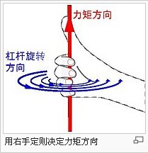力矩等于作用于杠桿的作用力乘以支點(diǎn)到力的垂直距離。例如,3 牛頓的作用力,施加于離支點(diǎn)2 米處,所產(chǎn)生的力矩,等于1牛頓的作用力,施加于離支點(diǎn)6米處,所產(chǎn)生的力矩。力矩是個(gè)矢量。力矩的方向與它所造成的旋轉(zhuǎn)運(yùn)動(dòng)的旋轉(zhuǎn)軸同方向。力矩的方向可以用右手定則來決定。假設(shè)作用力垂直于杠桿。將右手往杠桿的旋轉(zhuǎn)方向彎卷,伸直的大拇指與支點(diǎn)的旋轉(zhuǎn)軸同直線,則大拇指指向力矩的方向(如圖2)