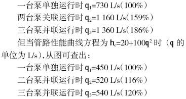 泵或風(fēng)機(jī)并聯(lián)運(yùn)行的主要目的是增大所輸送的流量。但流量增加的幅度大小與管路性能曲線的特性及并聯(lián)臺(tái)數(shù)有關(guān)。圖1所示為兩臺(tái)及三臺(tái)性能相同的20Sh-13型離心泵并聯(lián)時(shí),在不同陡度管路性能曲線下流量增加幅度的情況,從圖可見,當(dāng)管路性能曲線方程為