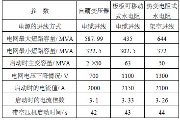 根據目前實際采集到的啟動曲線情況來看, 這3 種啟動方式都無特別明顯的優(yōu)勢和特別大的區(qū)別, 3 種不同的啟動方式將電網的壓降值都控制在電網允許的范圍內, 啟動電流的倍數都控制在額定電流的3 倍左右, 啟動時間都控制在42~45 秒內。由于各地現場的情況不完全一致, 實際運行情況肯定受其他啟動因素的影響, 所以認為這3 種啟動方式都是大型電機比較理想的啟動方式, 其對電網產生的壓降大小除了和當地電網容量有很大關系外,和其上級主變壓器的容量也有密不可分的關系。采取不同的電機啟動方式啟動空壓機時的技術參數比較見表1 。