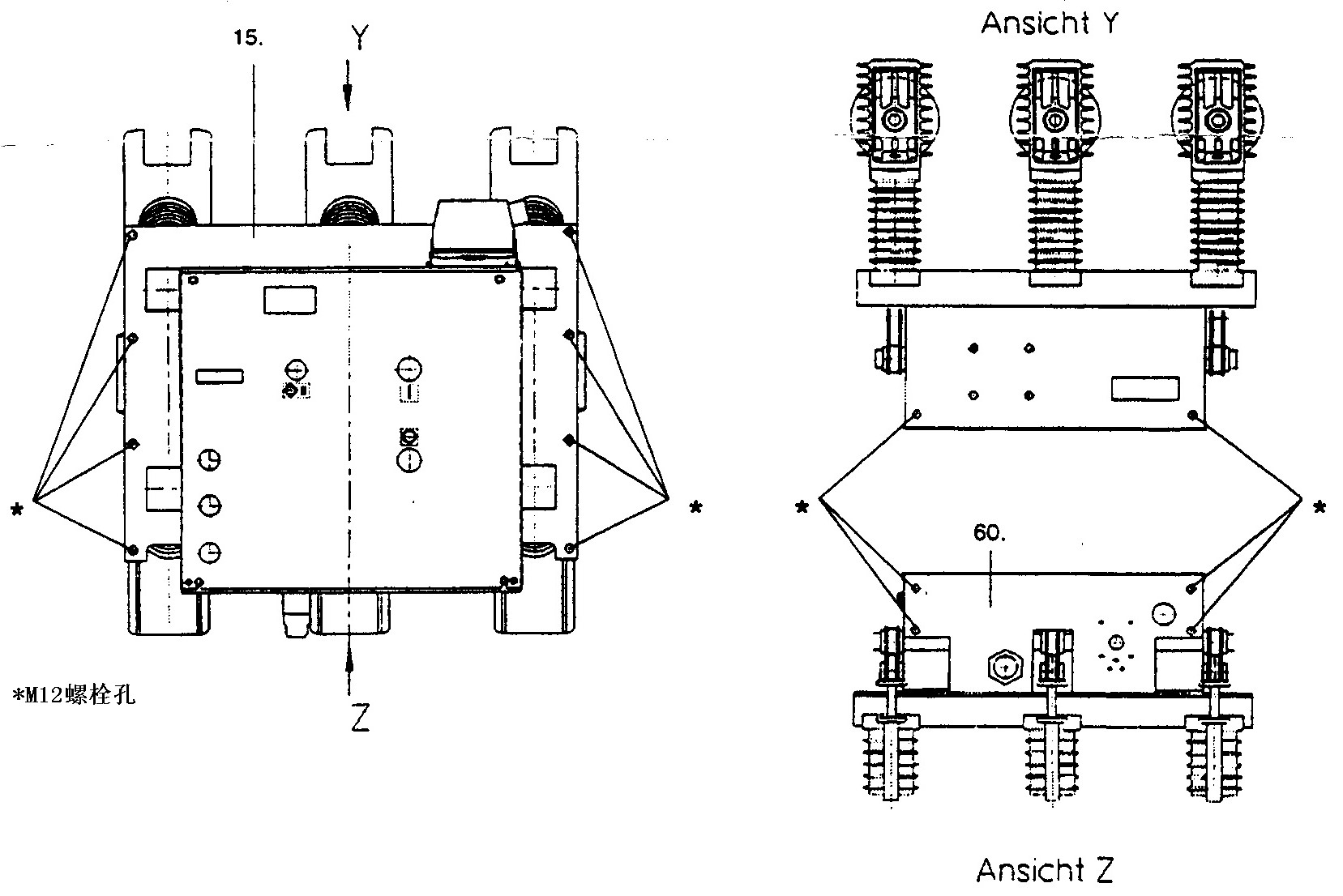 在柱狀板(15.)和機(jī)械柜(60.)上共有14個(gè)安裝孔適應(yīng)各種各樣的型號(hào)斷路器的安裝(圖3/1)。對(duì)于額定短路開斷電流≥50KA的源創(chuàng)電氣真空斷路器的安裝,我們推薦僅使用柱狀板。