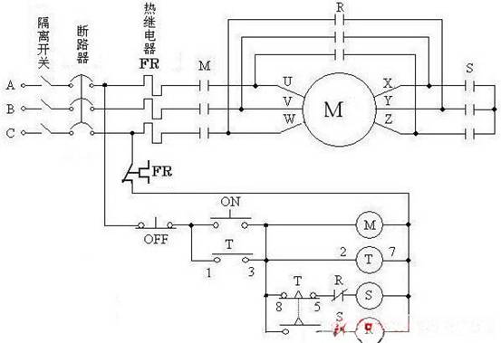 斷路器----按下ON啟動按鈕---M,S,T得電---M接通主回路,S通過T的常閉觸點(diǎn)及R的常閉觸點(diǎn)得電---S主回路接通--正在做起動運(yùn)轉(zhuǎn)過程。